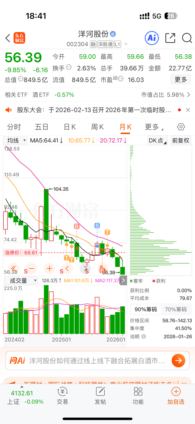 $洋河股份(SZ002304)$ 目标价下调到50 50以下我买一点