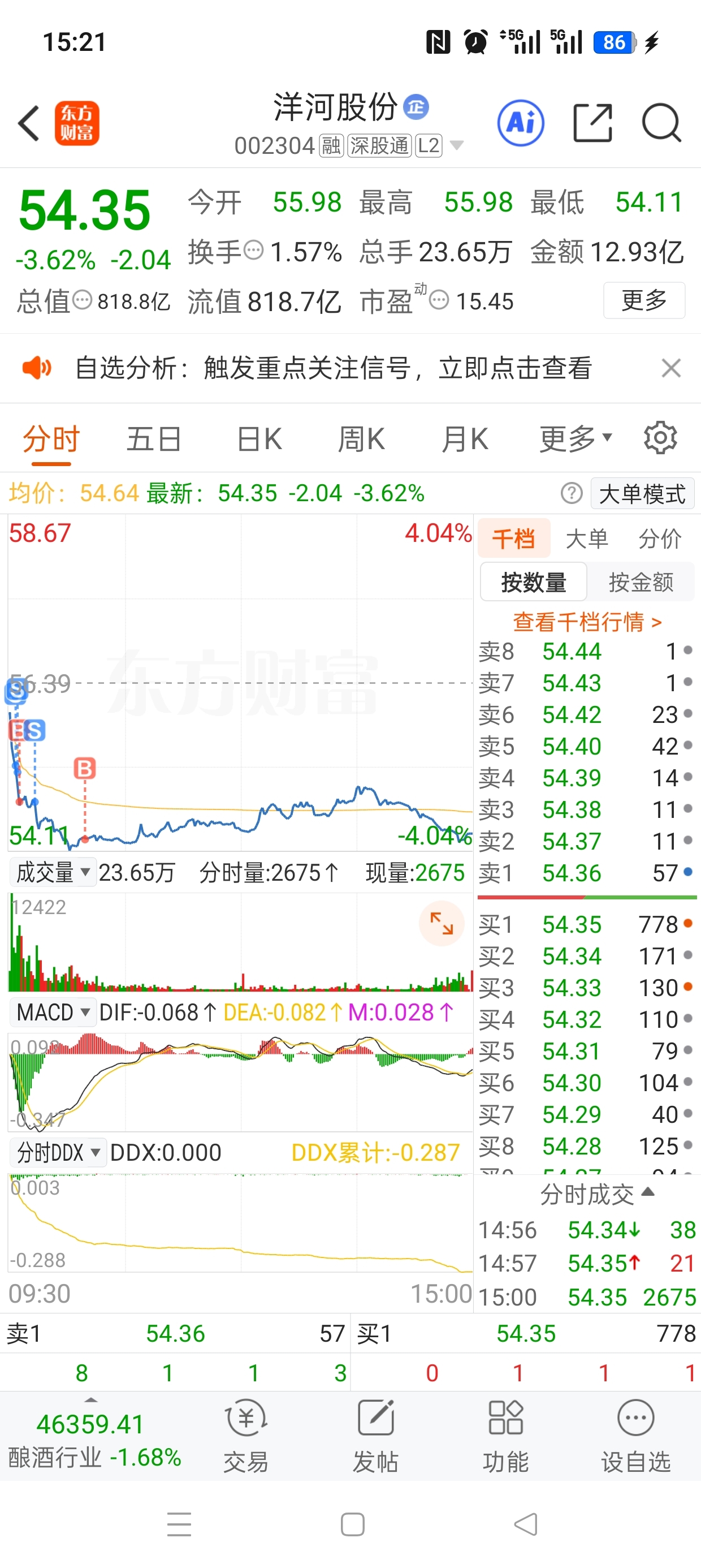 $洋河股份(SZ002304)$ 不卖不行,后悔又追进去了,买其他的下午拉升都能赚4-5个点
