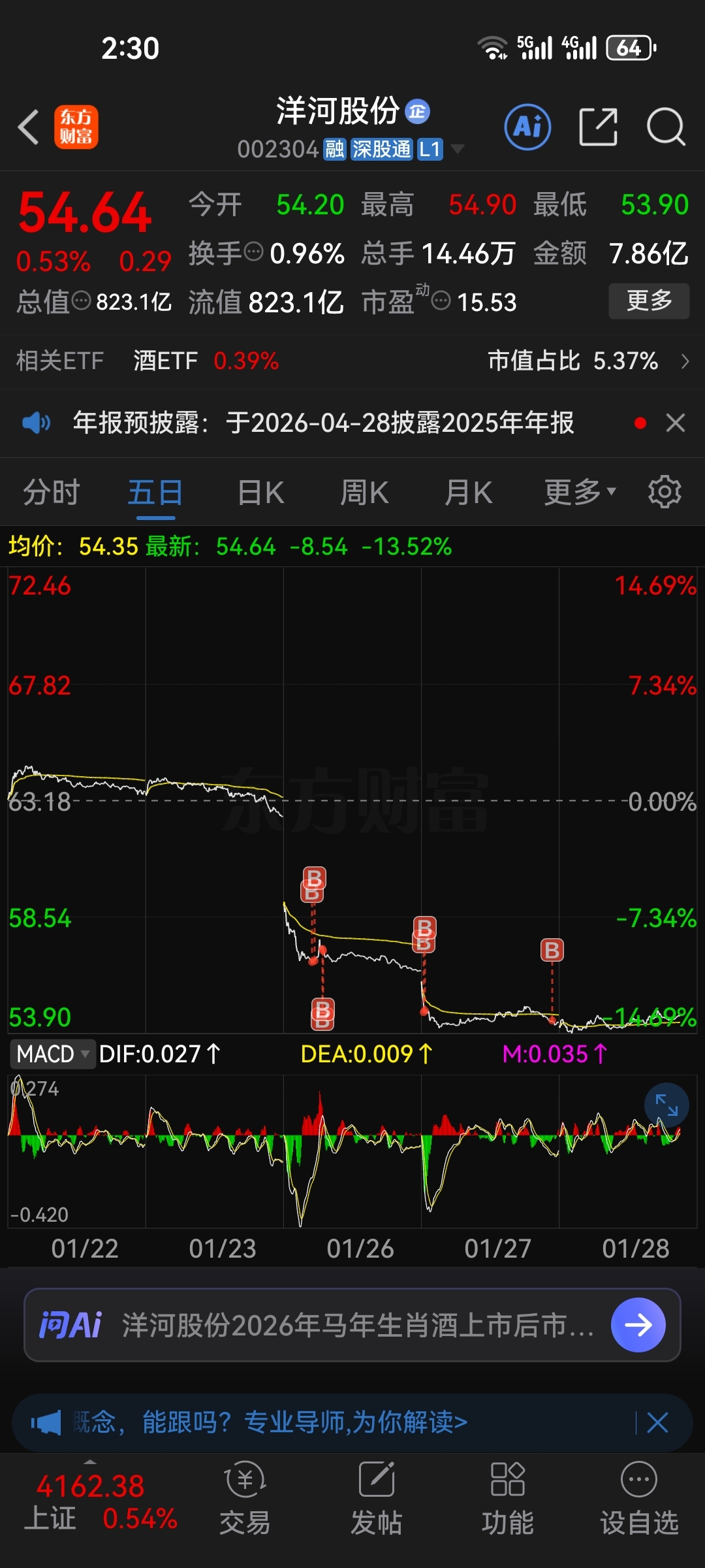 $洋河股份(SZ002304)$ #炒股日记# 以为抄到低了谁知道被套了亏了钱。什么时候涨回来?
