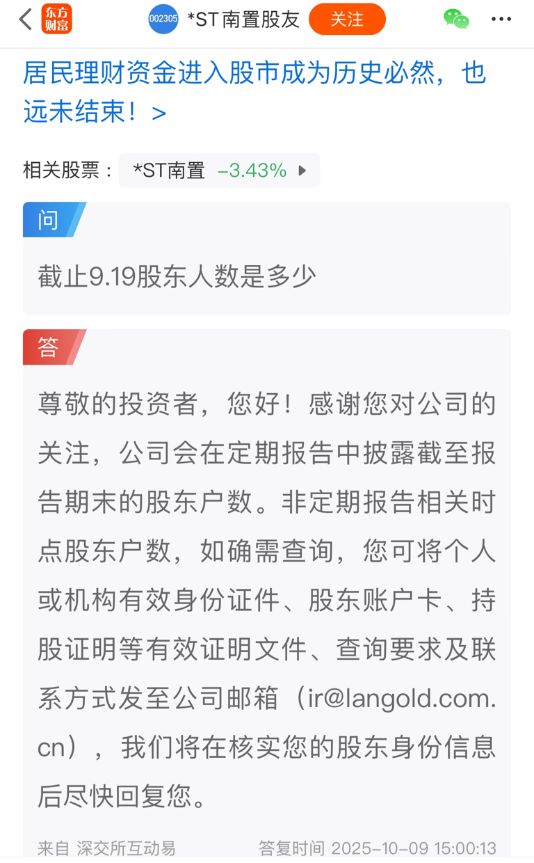 我去,全大A估计也就南国能这么回复了,股东人数一个最最普通且需要定期公布的数据,