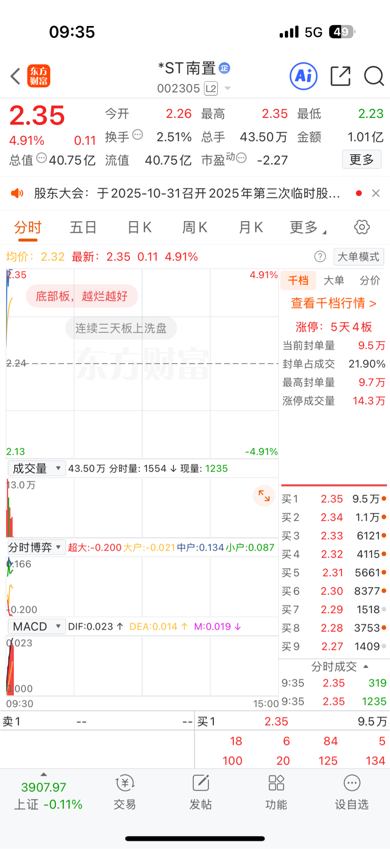 $*ST南置(SZ002305)$ 9:35涨停到收盘成交了三万多手,缩量太多了。#收盘点评#