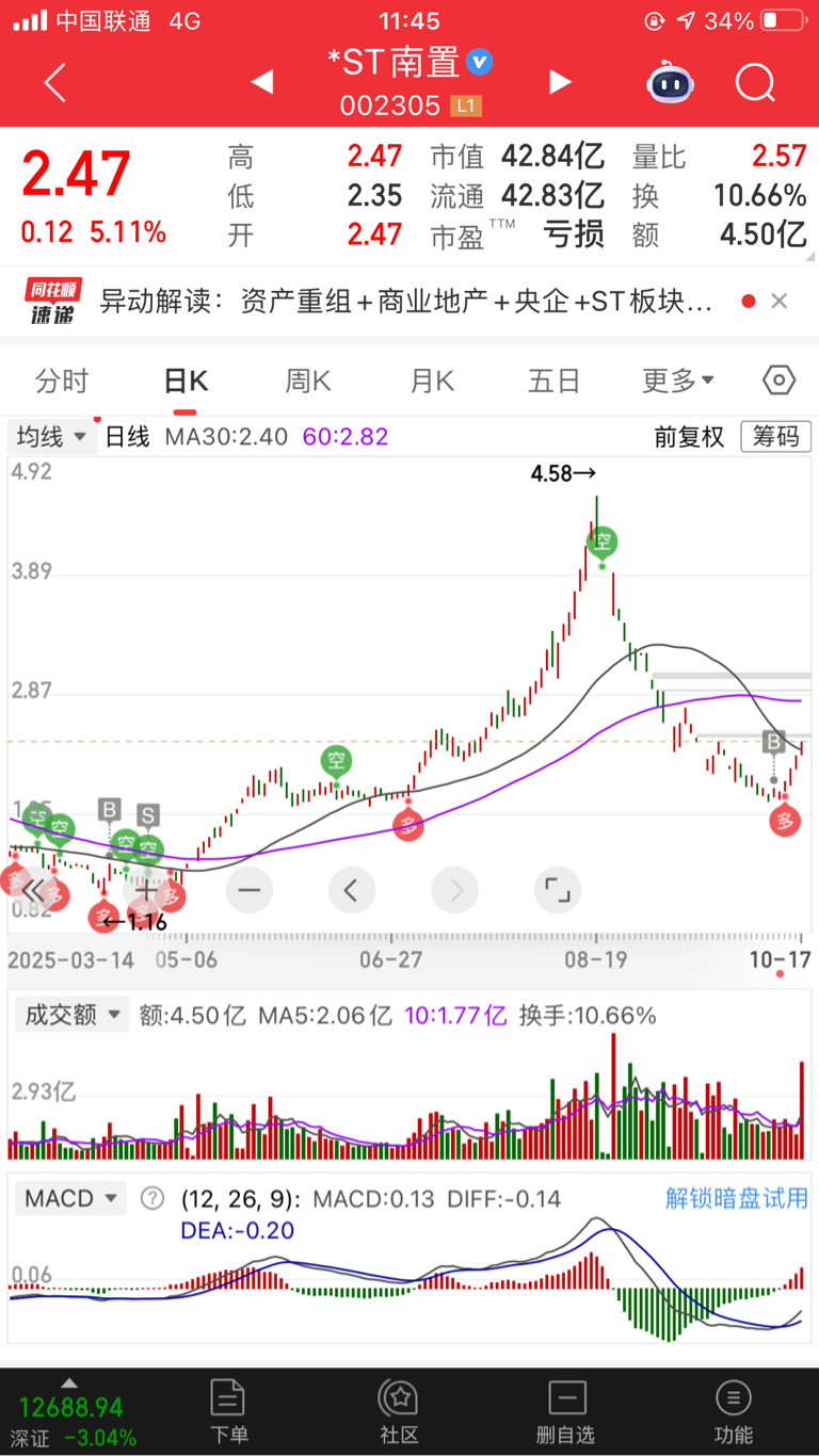 $*ST南置(SZ002305)$ 股菜鸟又买进这个票了