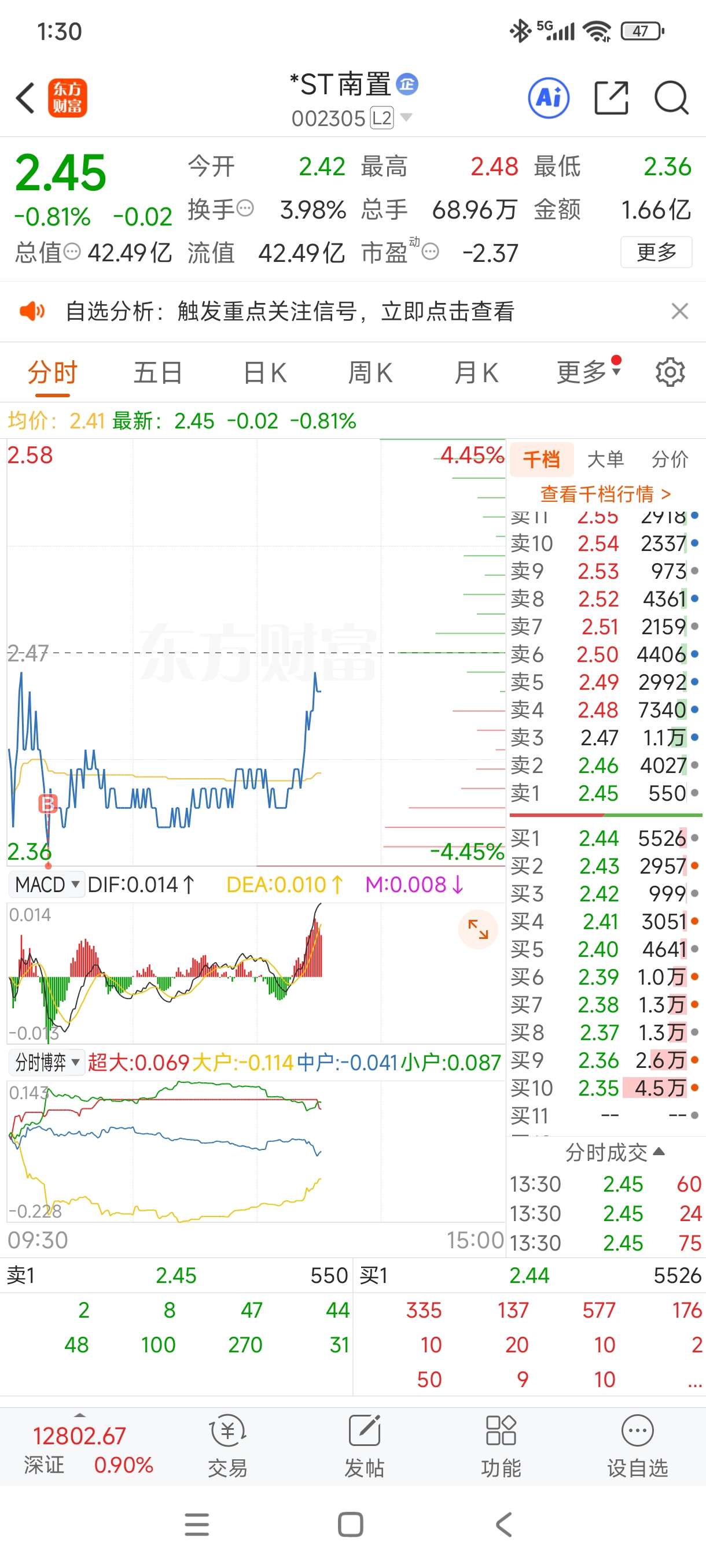 $*ST南置(SZ002305)$ 上周走的,今天最低点掏回来了