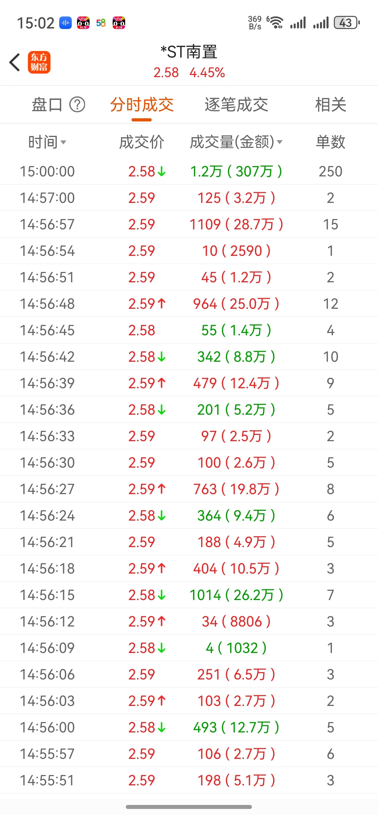 $*ST南置(SZ002305)$ 最后一分钟走了1.2万股金额307万是什么意思?