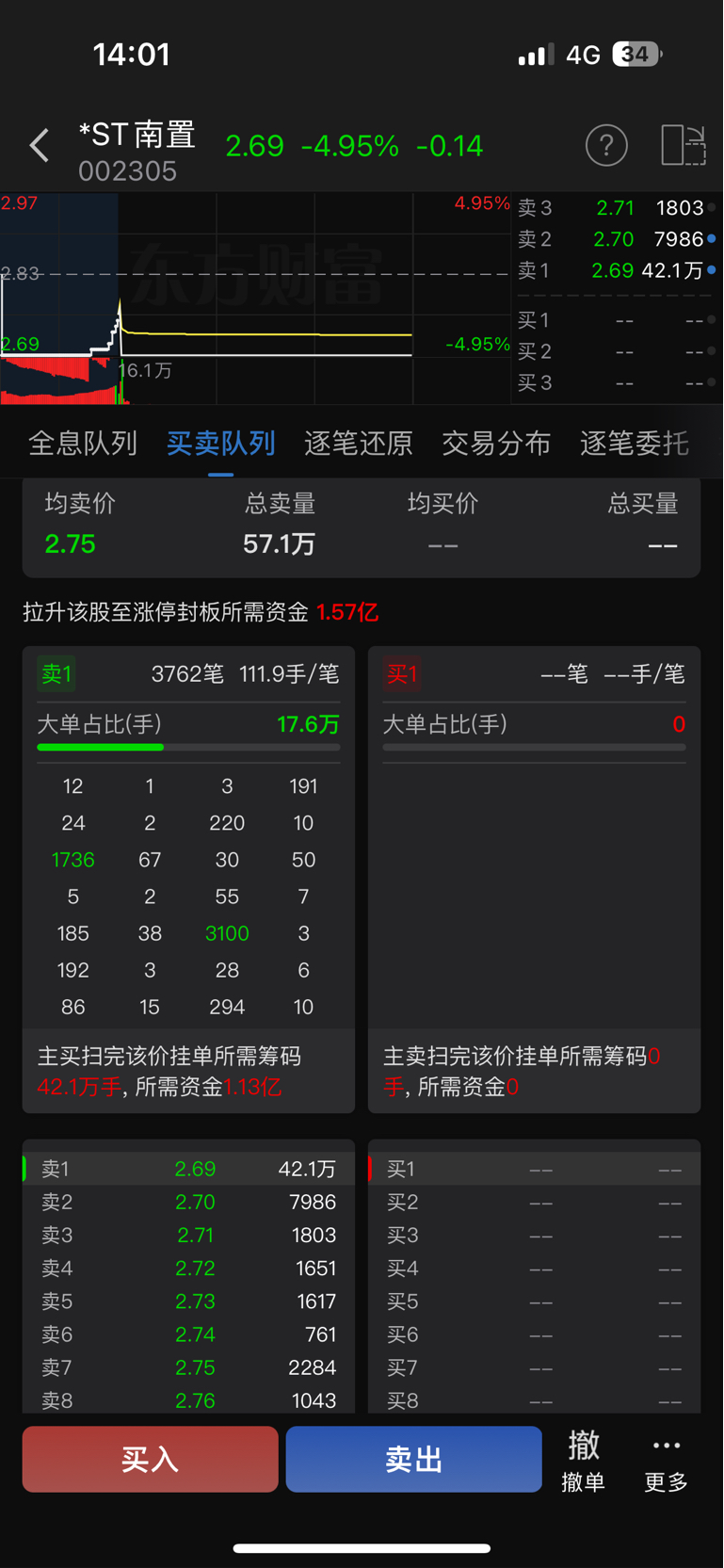 $*ST南置(SZ002305)$ 42万手封单,主力大单17万手,剩下25万手都是拉萨家人们互相踩踏啊!和钩庄同归于尽吗