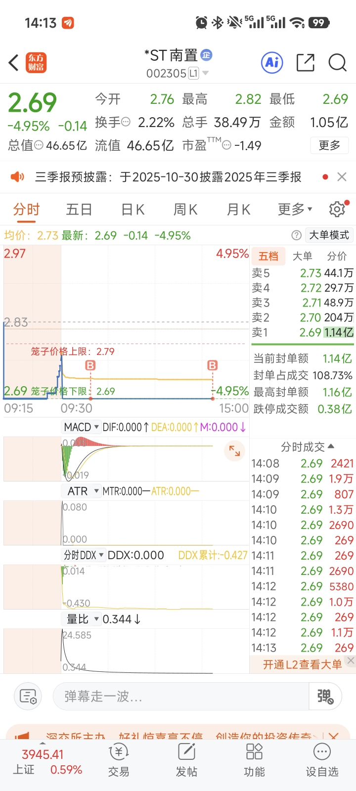 $*ST南置(SZ002305)$ 今天应该不得亏了吧