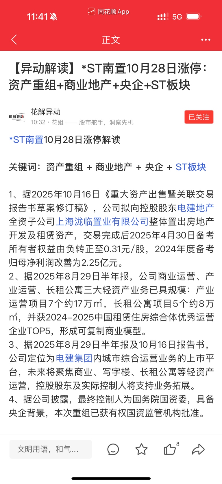 $*ST南置(SZ002305)$ 小燕子预测明天走个一字板让割了的人上不了车,迎接质变的三季报公告,周四周五继续一字板迎接股东大会,点一个赞加一个涨停板,有仓位的都来点赞