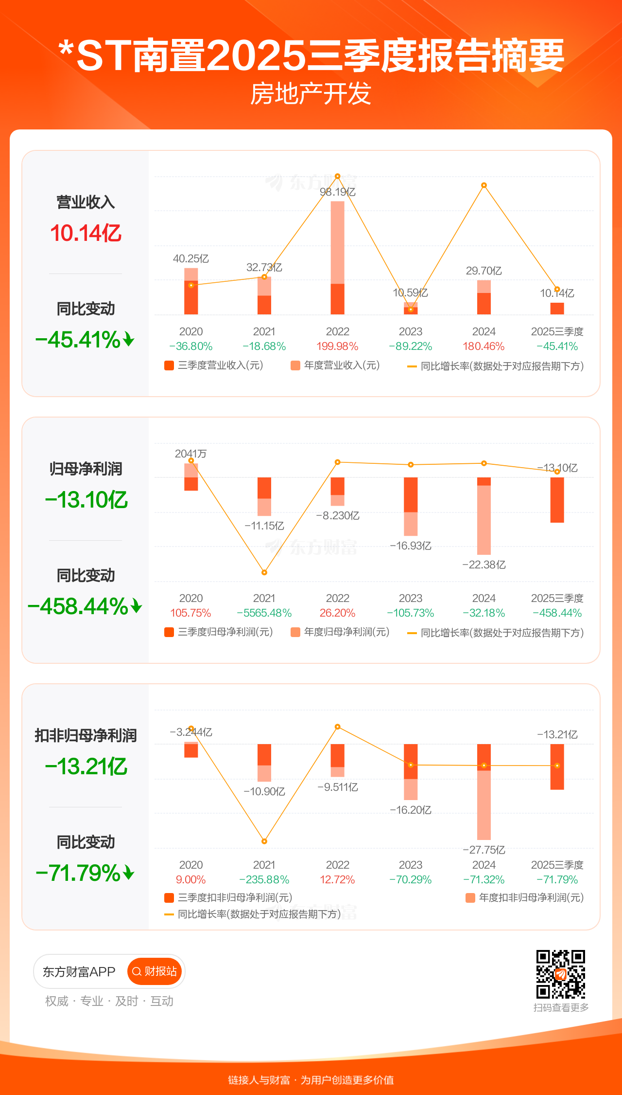 *ST南置10月30日发布2025年三季报显示,公司前三季实现营业收入10.14亿元,同比下滑45.41%;归母净利润-13.10亿元;扣非归母净利润-13.21亿元。