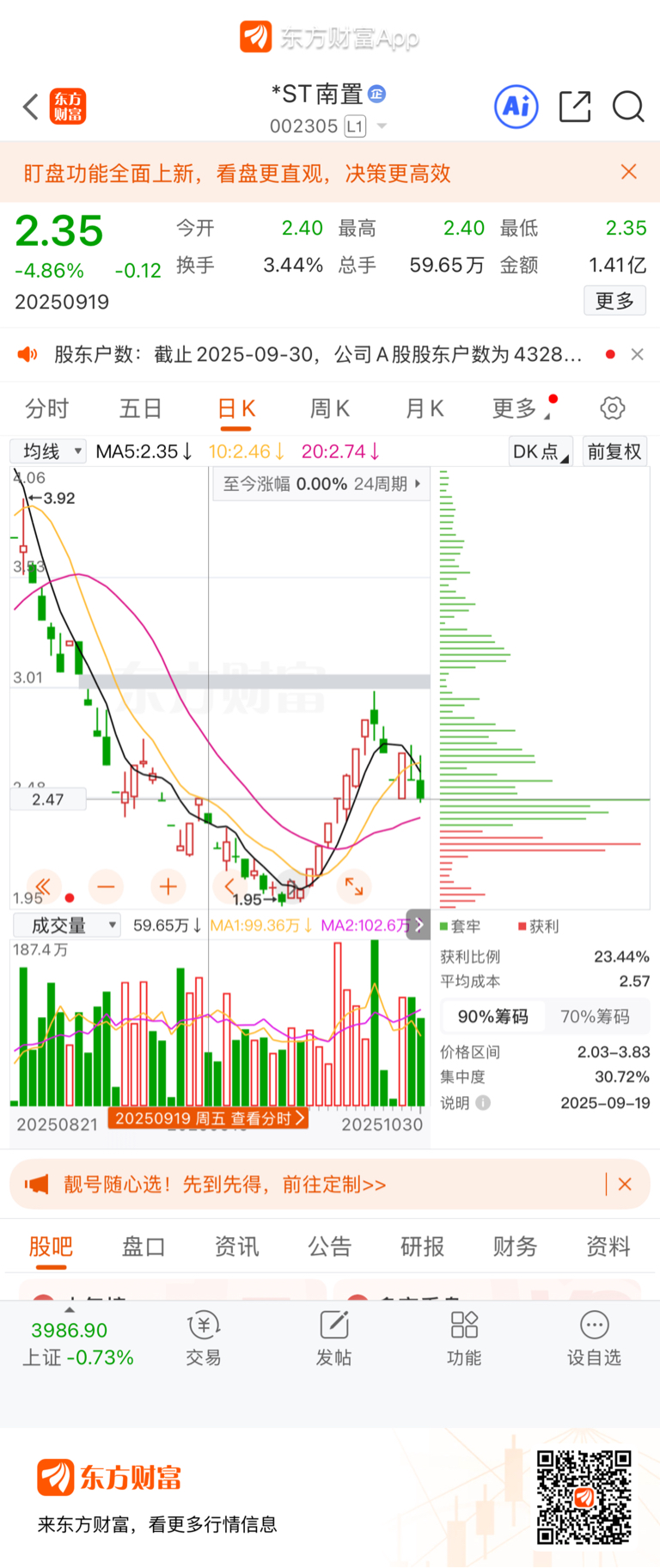 $*ST南置(SZ002305)$ 南置今天高开又底走,又重新站回关健点2.47,换手率5点多,是主力诱多还是吃货?还有就是明天就召开股东大会了,后续如何?很期待!欢迎各位指点发言!