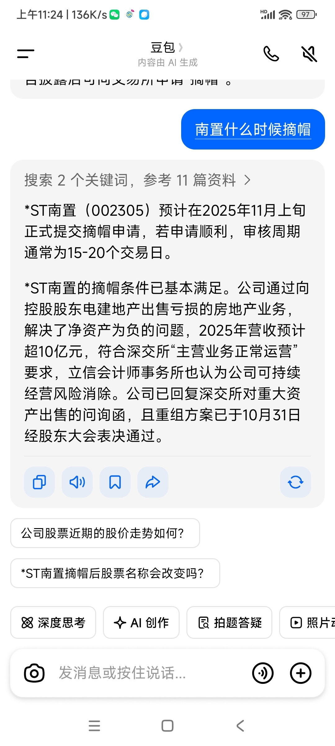 $*ST南置(SZ002305)$ 准备拿到过年了,摘帽股会炒一波