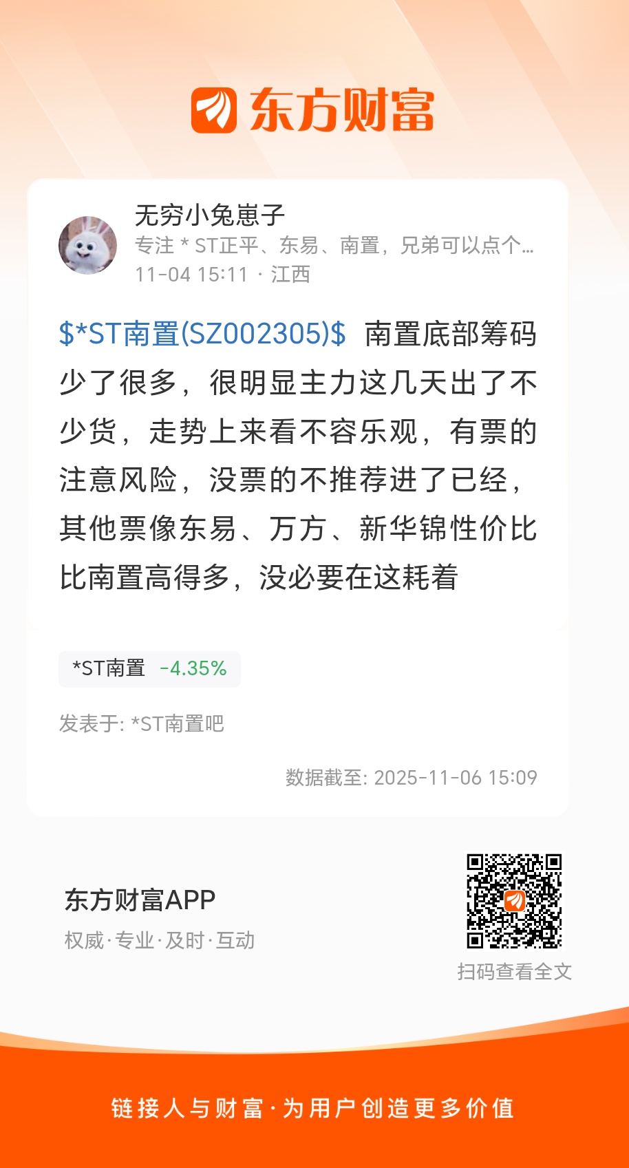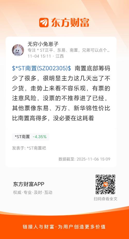 $*ST南置(SZ002305)$四号的时候就已经提醒过各位了,南置这票在短期是看空的,依据是底部筹码少了很多,很明显主力已经放量出货了,不适合短线获利。当时能听进兔子的兄弟已经止损了。兔子走的更早,28号打板进的,29号跌停走弱炸板的时候就已经走了,当时兔子也发了帖子,感兴趣的兄弟可以翻翻看。然后和兄弟们分享一下兔子当前的持仓。80%的仓位在正平进黑屋镀金了,虽然停十个交易日也就是半个月了,但是兔子还是很安心的,这票逻辑性太强,青海第一算力+大面积高质量铜矿。有懂的兄弟自然懂,兔子也不多说了。20%的仓位是在ST打野的,当时从南置出来也考虑过进去东易、万方、新华锦。但是都一直没有大回调,因为随时都有回调的风险,兔子也不愿意去高位接盘。最后3号是在ST节能和ST阳光里面二选一选了节能打板进去的。一开始兔子还以为选错了,阳光走的比节能强一点。但是这两天节能走的又比阳光强的多,也还是挺幸运的当时选对了。截止目前6号收盘走出来5天4板,也还算挺强,缩量板还是走得比较健康的。感兴趣的兄弟也可以适当关注关注,这票短线兔子认为还算强势。最后和大家聊聊东易、万方、新华锦这三个票。东易应该是十几个交易日只绿了一天,走的还是很强势的,主力不愿意给出低价筹码,想进去的只能追涨。但是最近也都还是疑似走天地天放量的趋势了,相对而言有点回调的迹象。万方的回调很干脆,直接两个一字跌停关门制造恐慌盘。但是底部筹码基本没少。兔子个人认为万方是在用跌停洗盘,明天周五或者下周一的地板价大概率就是万方的买点了。可以重点关注一下这个票。新华锦的回调还是有点犹豫。这个票兔子不好评价,但是后续的走势大概率是比万方要弱的。兔子也仅仅是和大家分享一下内心最真实的看法,不作为投资依据,可供兄弟们参考参考。祝各位都能天天吃板