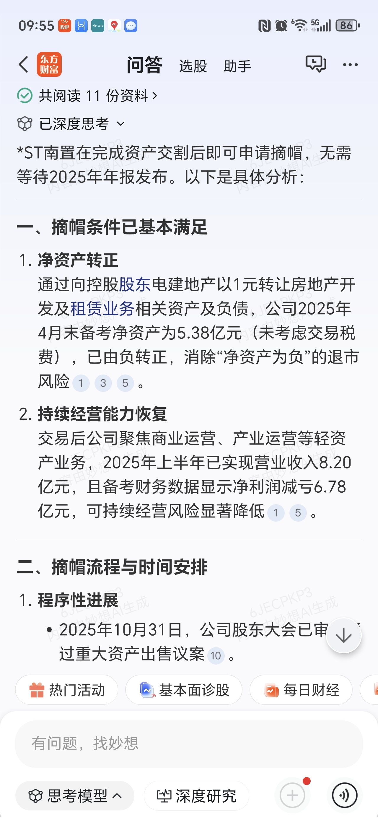 $*ST南置(SZ002305)$ 股吧自己的AI,回复的也是不需要等到明年才摘帽,不需要等财报。所以近期就会交割了,随时准备摘帽了。