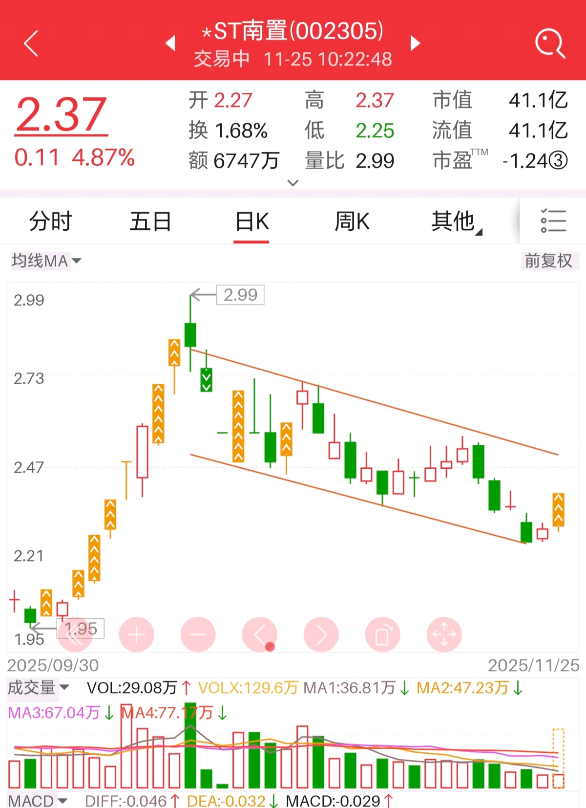 $*ST南置(SZ002305)$ 如期反弹,他要去摸下跌通道的上轨了,大概位置就是2.47附近。也就一个涨停板空间,打到这里就先卖出,防止再跌。没利好大概率上不去