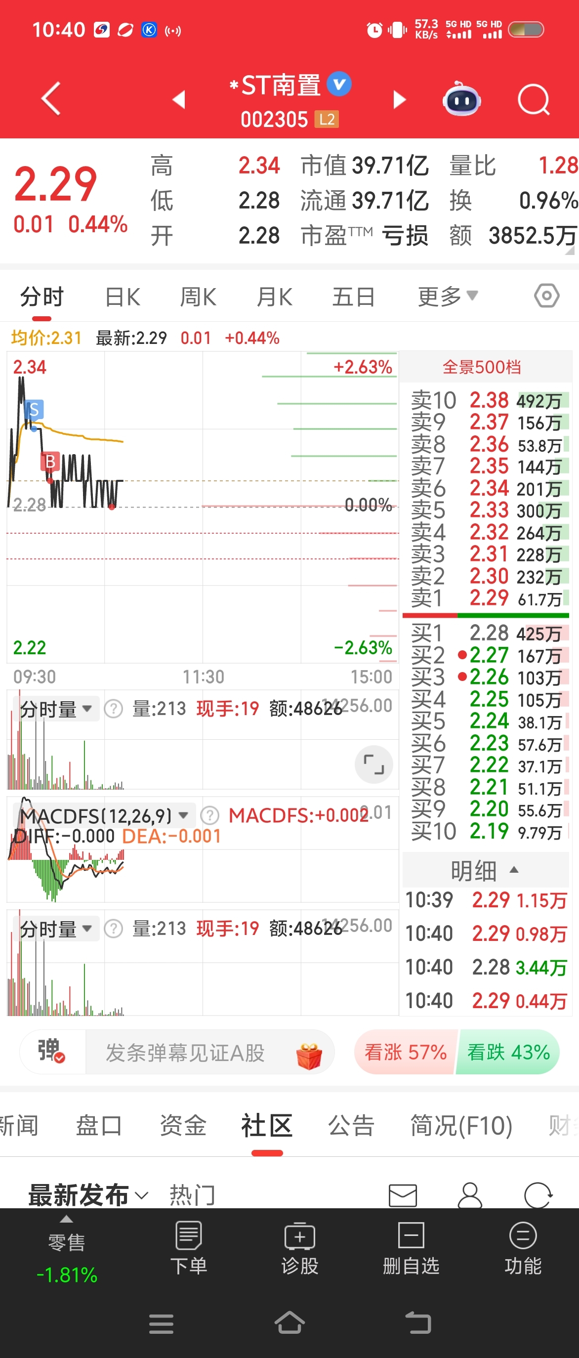 $*ST南置(SZ002305)$ 昨天2.27进的,没破34做个T吧