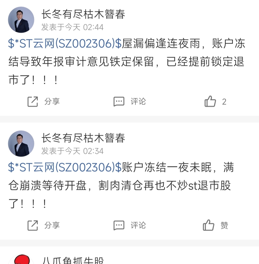 $*ST云网(SZ002306)$ 这个人昨天还说开盘被洗出来了,现在开始唱空了,说自己满仓,等待崩溃,一看昨天发的帖子都不见了,现在我明白了,唱空都是想要筹码的
