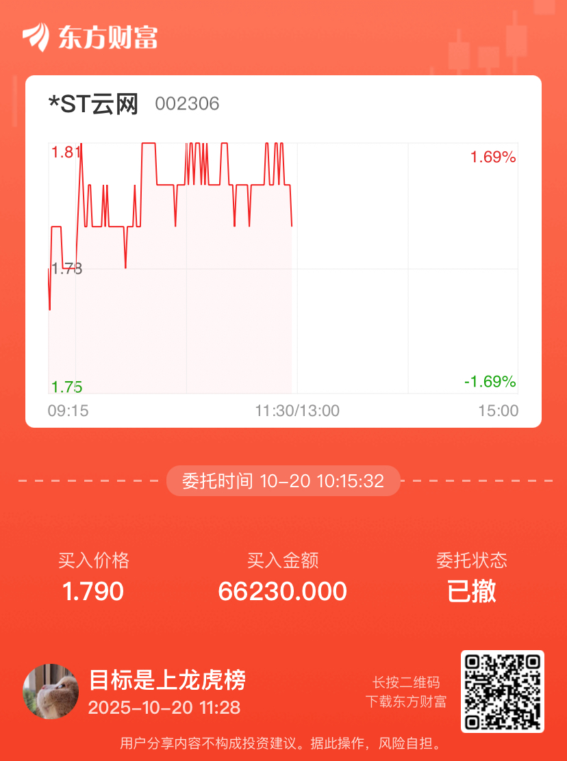 $*ST云网(SZ002306)$ 撤单了不加仓了,看着1.79马上就到我的了,直接撤今天1.78收盘,明天今天横盘阴跌一分钱,等一朵红色玫瑰不唱多了再进