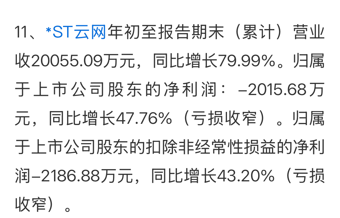 $*ST云网(SZ002306)$ 营收同比增长,利润同比增长,亏损减少同比收窄,小学生也能看明白的公告,空狗们别胡咧咧了。