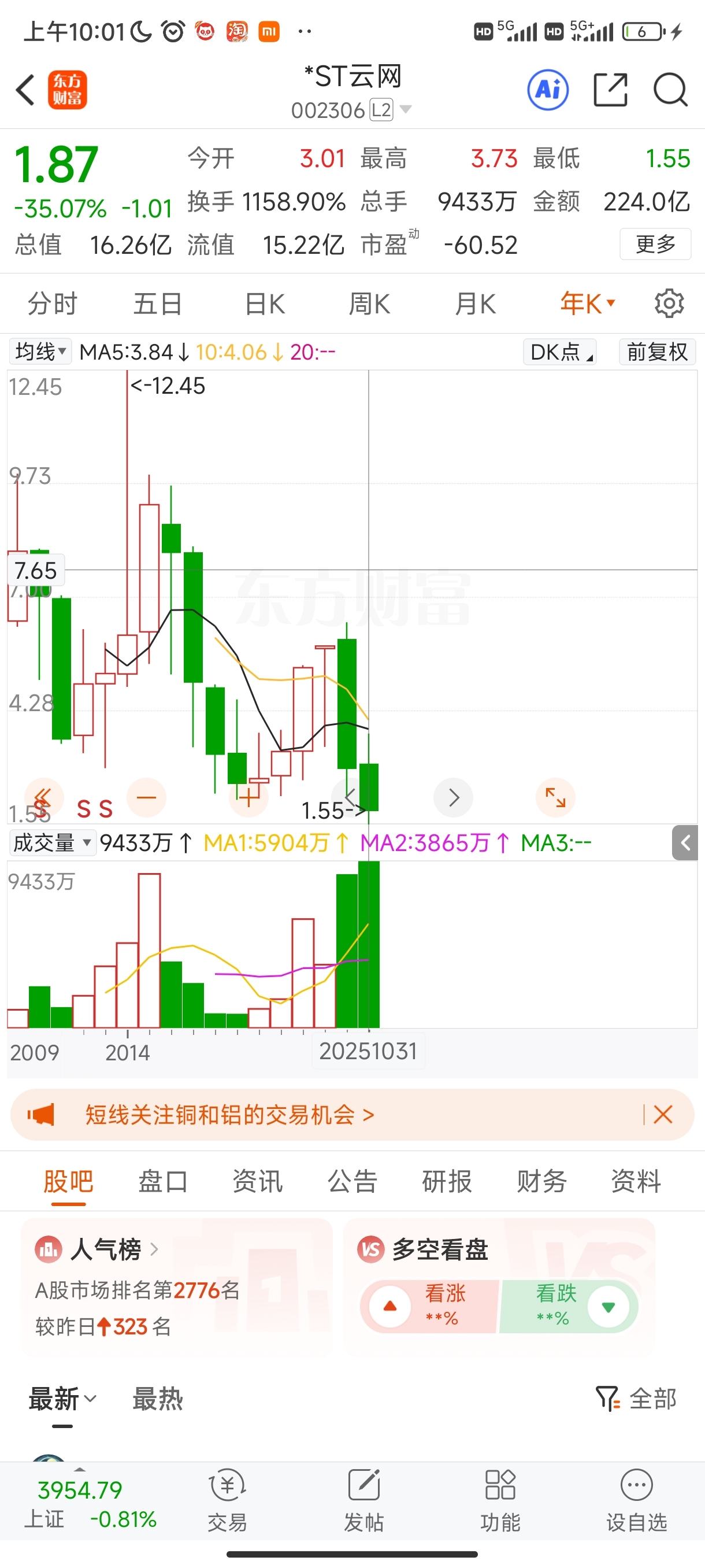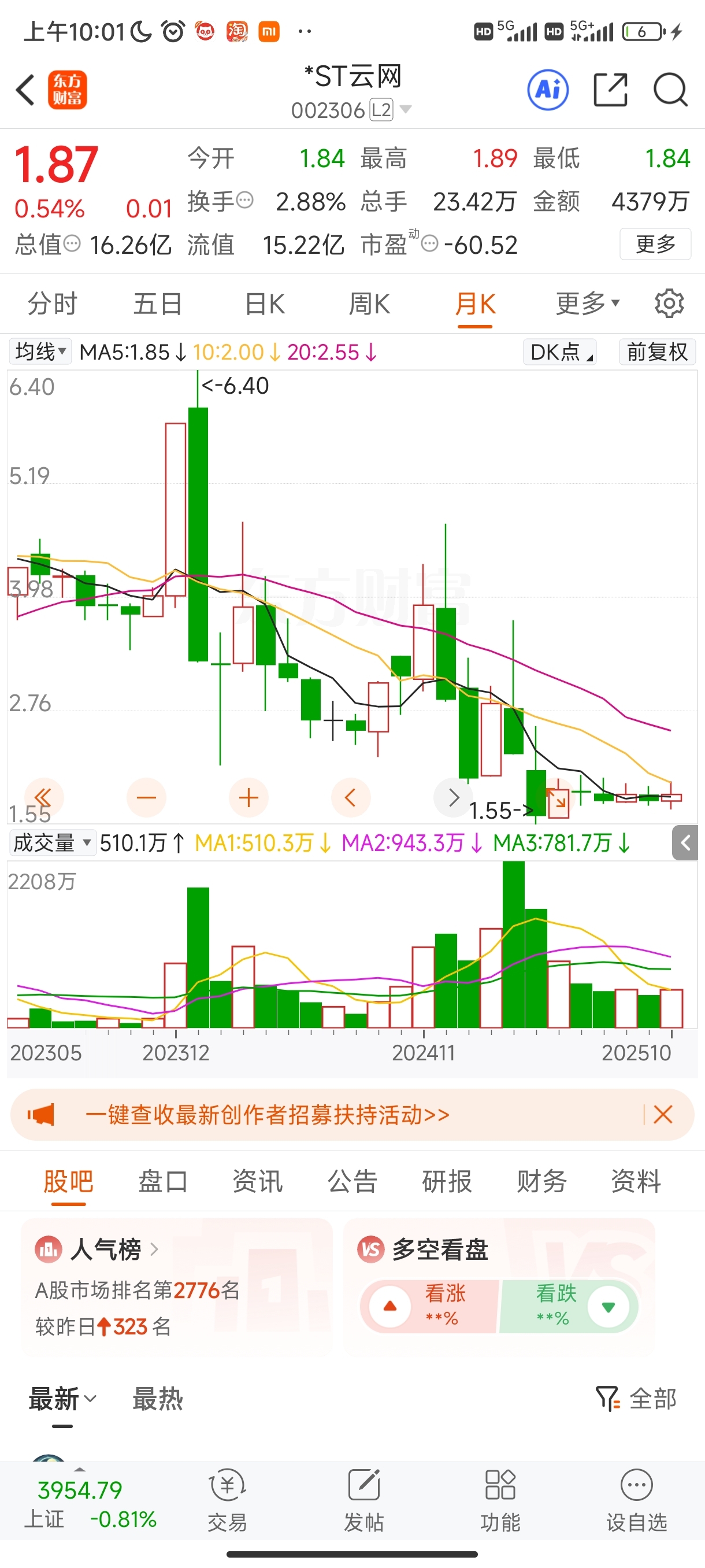 $*ST云网(SZ002306)$ $*ST宇顺(SZ002289)$ $*ST亚振(SH603389)$ 三成仓干云网,跌到1.5元6成仓干,跌到一元,全仓干!!!买在二千点,套在四千点,原来持有云网的兄弟们已经完美错过牛市,就死磕到底!!!资金量大的过来买点压压底仓,二元钱,买个千手万手也没有多少钱,万一像其它的一样2元到几十元呢??怕风险与亏钱都不要玩了。。。。