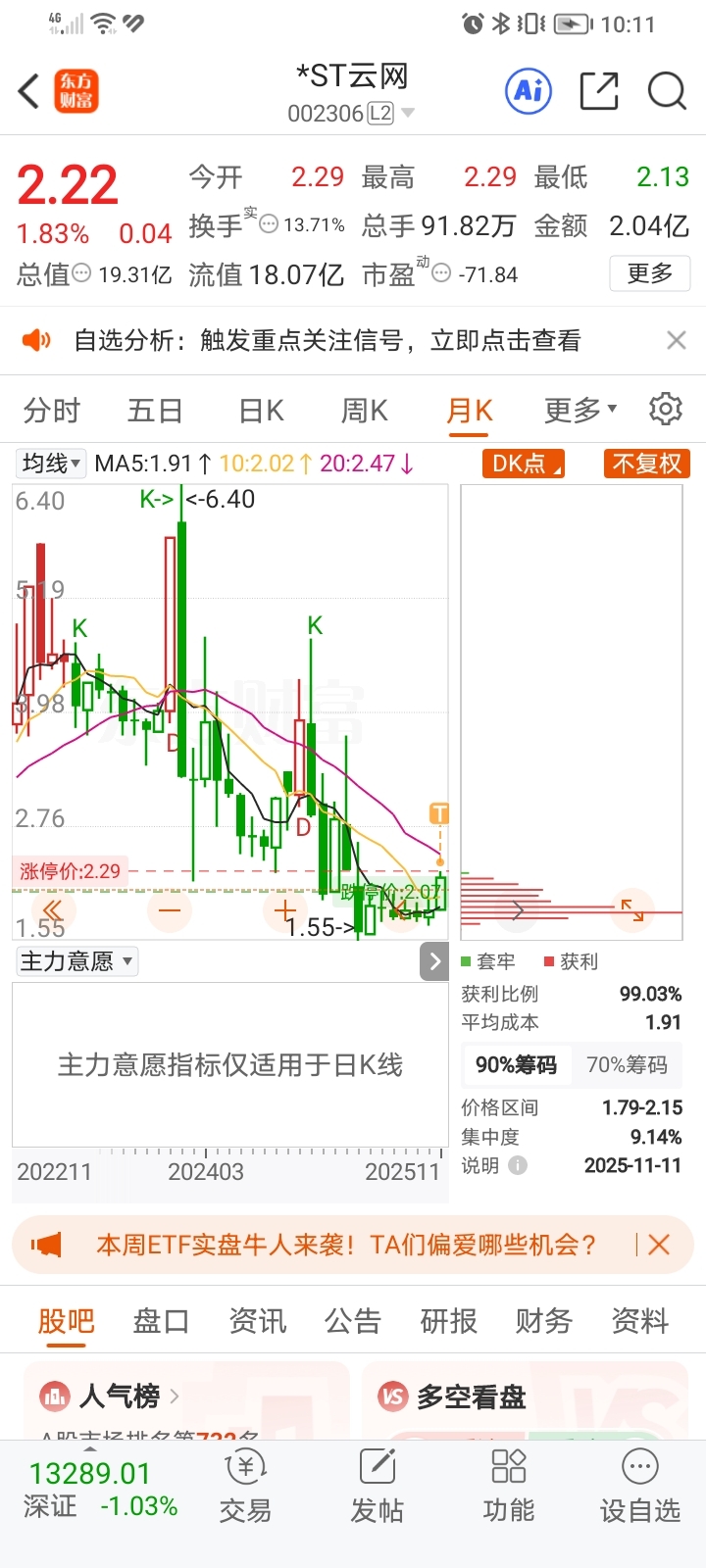 $*ST云网(SZ002306)$ · 1分钟前 · 1阅读这两年没玩ST股太可惜了,正股这里搞一下那里搞一下也没挣到钱,以前ST大集0.85拿到2块多,ST泛海0.85拿到3.35。正股超短线越来越没耐心,还是腾一部分仓位出来玩ST了,就从云网开始吧