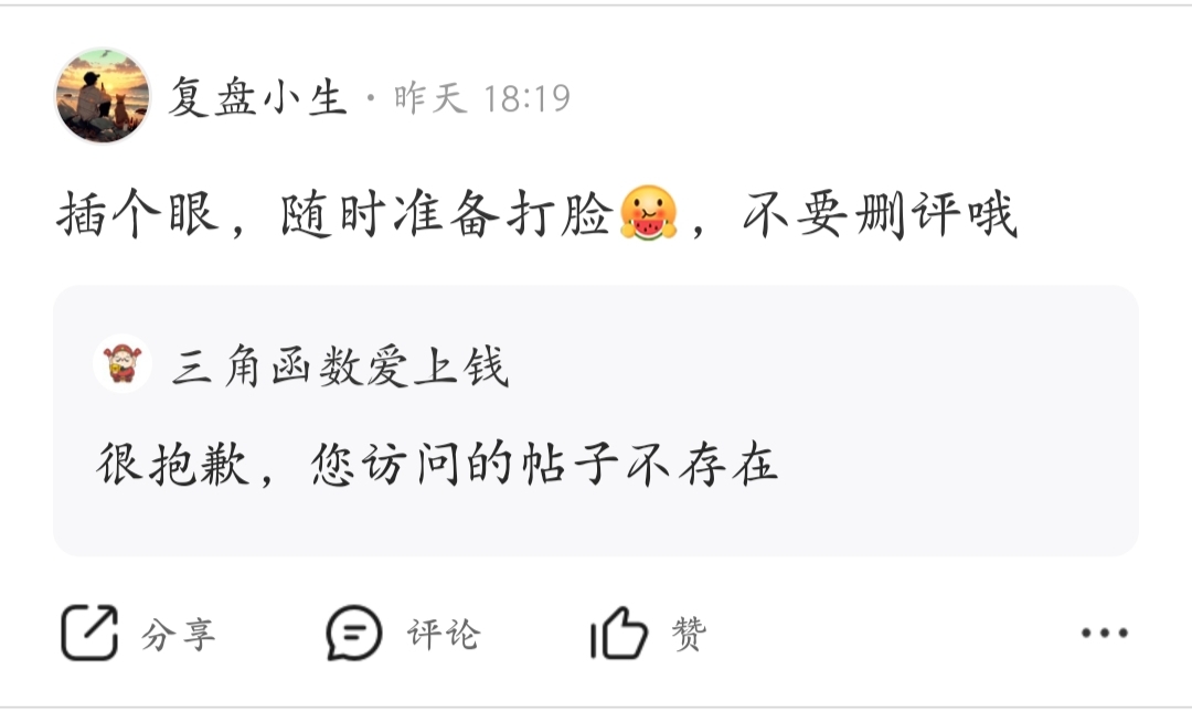 幽默删评哥,昨天说今天会跌停,结果自己玩不起了