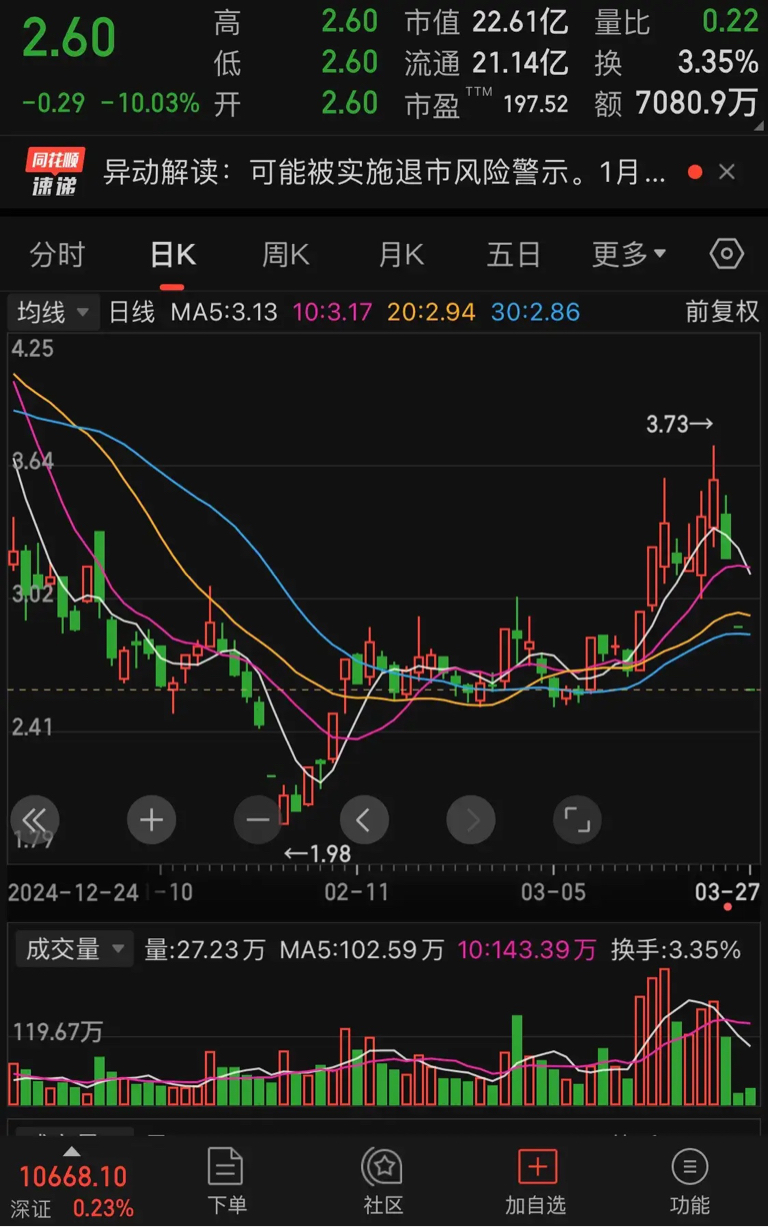 $*ST云网(SZ002306)$ 跟3月27日那几天很像,拉高连跌几天之后又慢慢起来了
