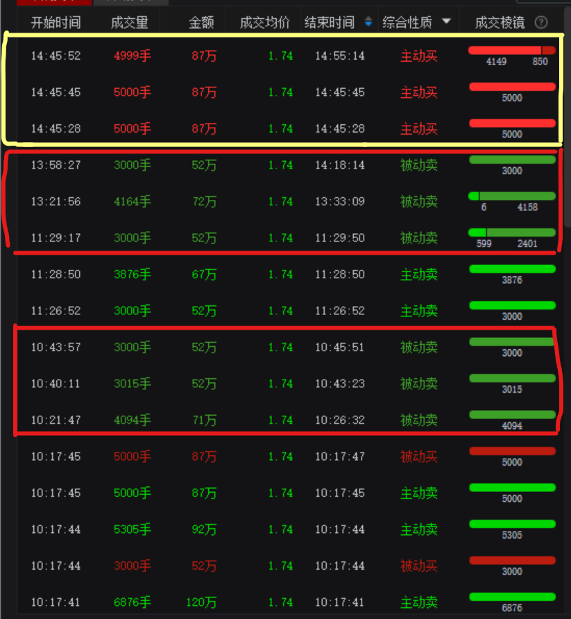 暗绿是被动卖,是指把买1下面筹码一起吃掉!是强买入。