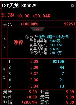 *ST天龙获赠现金2500万,20厘米涨停板!