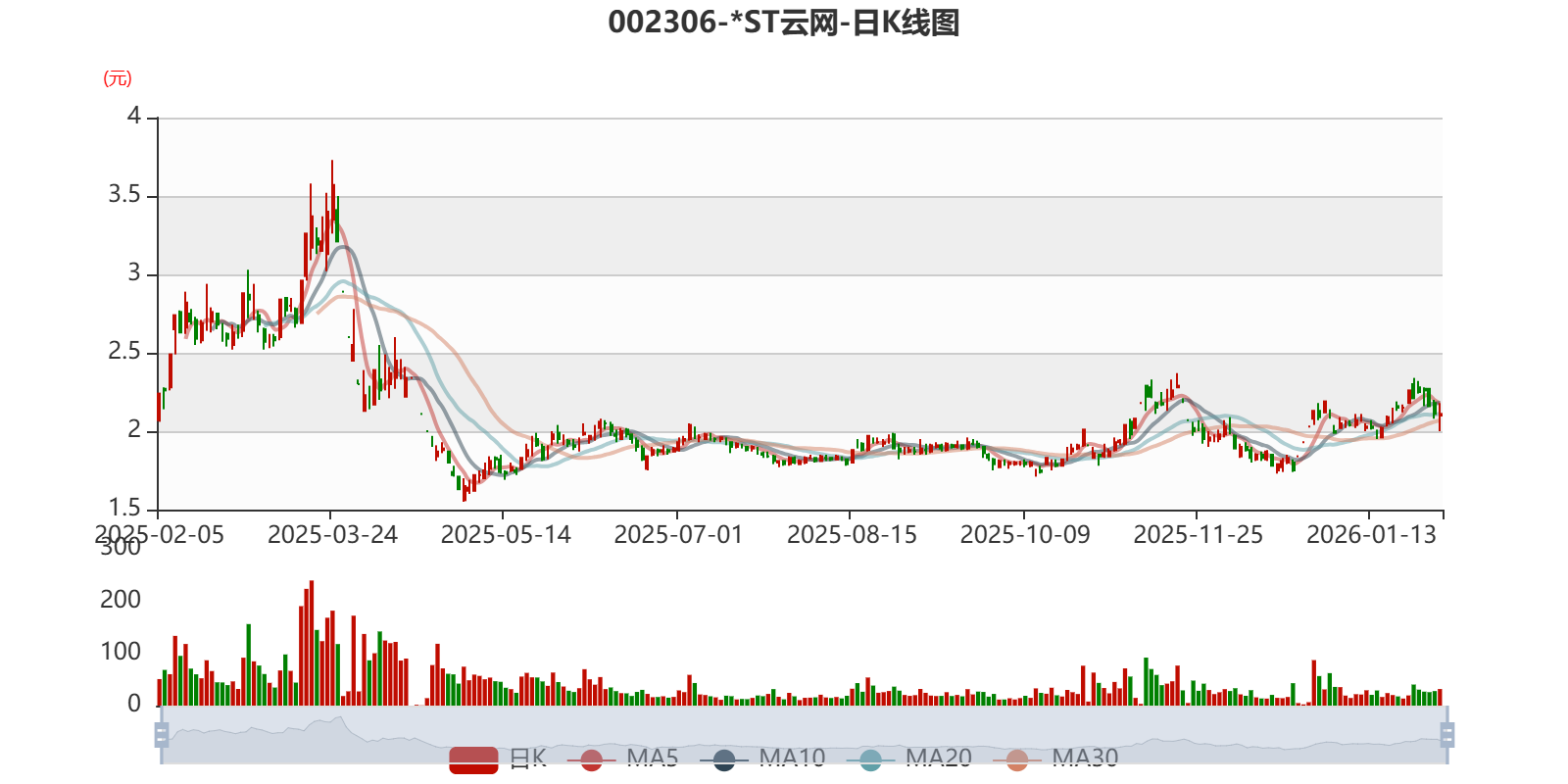中证智能财讯 *ST云网(002306)1月30日晚间披露2025年度业绩预告,预计2025年实现营业收入3.1亿元至3.3亿元;归母净利润亏损6000万元至7000万元,上年同期亏损3332.61万元;扣非净利润亏损6000万元至7000万元,上年同期亏损3564.31万元;基本每股收益-0.0733元/股至-0.0855元/股。以最新收盘价计算,市净率(LF)约-48.14倍,市销率(TTM)约5.73倍。
