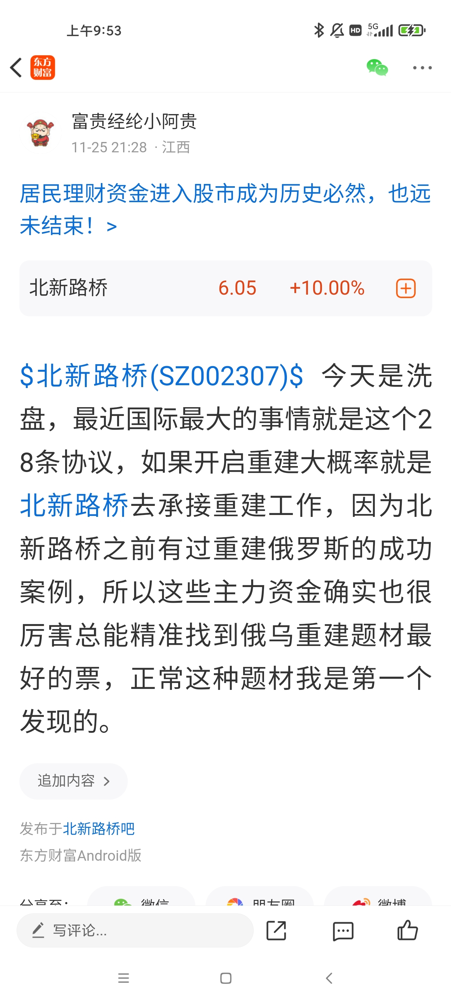 $北新路桥(SZ002307)$ 24号晚上发帖让大家接力,昨天晚上公布答案是洗盘,主要最近主力确实够坏,3000亿美金相当于2万亿,对标当时雅下水电站是1万亿投资就可以推测远远没有结束。北新路桥-北方要重新建设,修路修桥。名字决定命运