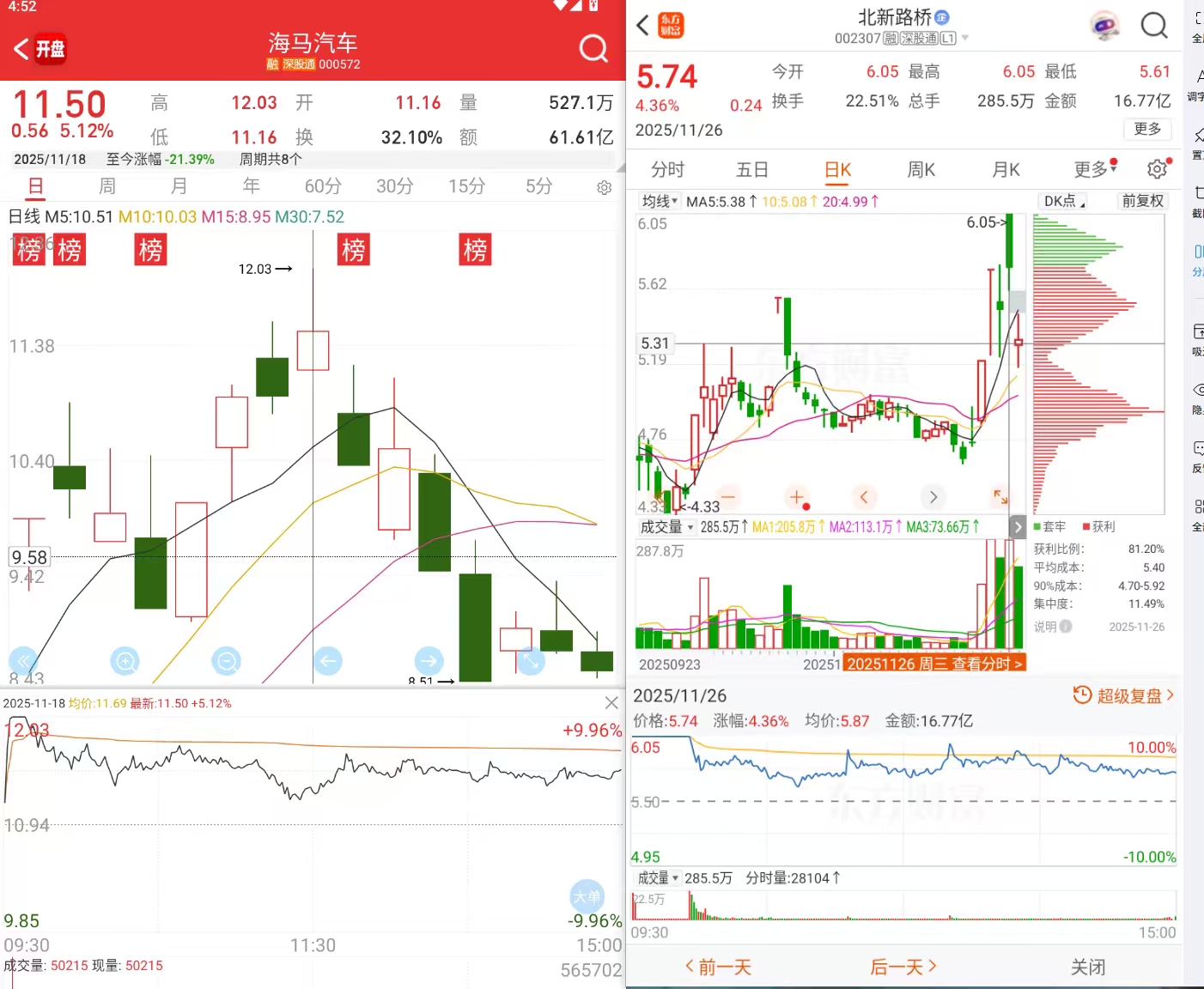 都是二连板 第三天阴线,第四天炸板高开低走,第五天水下震荡!就看第六天给不给一跟阳线了!当然海马的位置比较高一点,相对来说北新路桥还是低位!