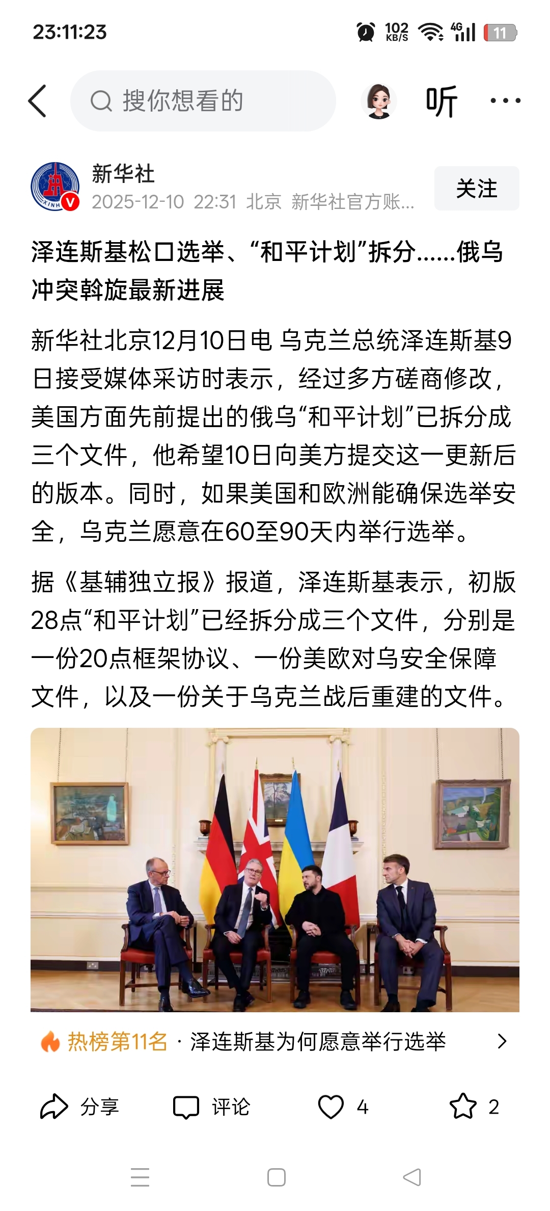 新华社,泽连斯基表态,和平计划细分,确保安全选举。和平进程再向前迈出一步!
