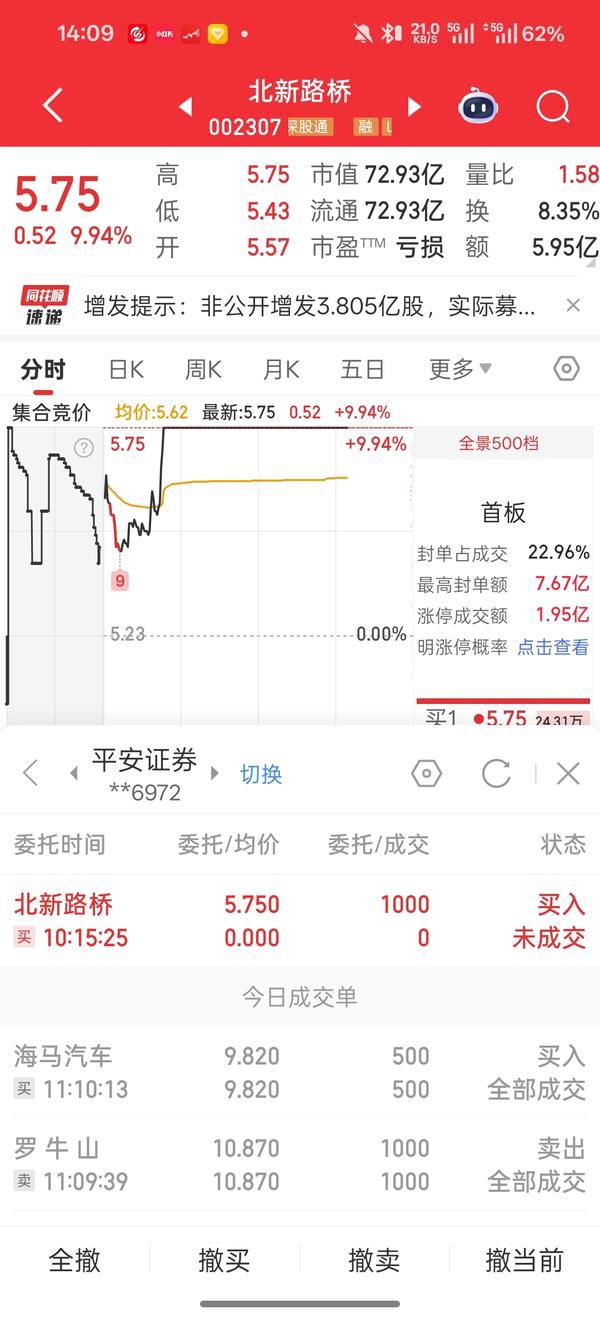 $北新路桥(SZ002307)$ 别看封单少,封板瞬间打板等到尾盘都排不进去