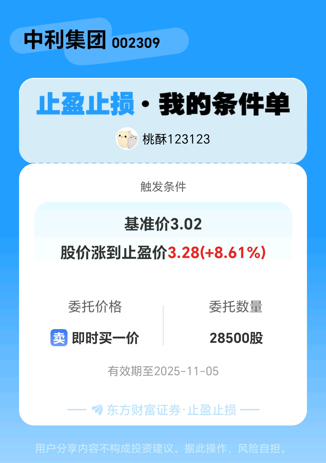 #条件单交流# #止盈止损晒单# 一位股神设置了一个止盈止损条件单,接下来就是见证奇迹的时刻~$中利集团(SZ002309)$