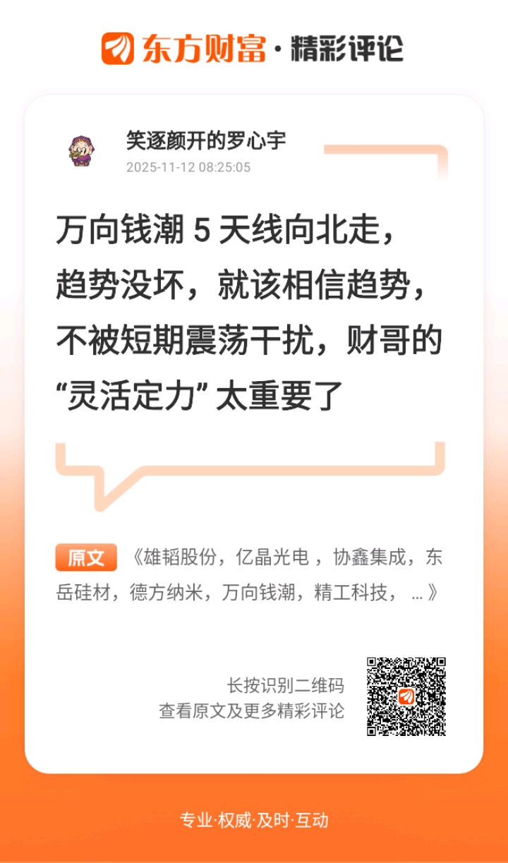 万向钱潮:5 天线向北走,为啥说 “考验定力”?(心态:“相信趋势,不被杂音干扰”)万向钱潮 5 天线还在向北走,没拐头,这时候最考验定力。震荡市中,趋势没坏的标的容易反复洗盘,散户容易被 “要不要卖” 的杂音干扰,结果慌着卖了就踏空。我的心态是 “相信趋势信号,忽略短期波动”——5 天线是简单有效的趋势信号,只要它没拐头向下,就说明趋势还在,没必要因为一两天的震荡就乱操作。