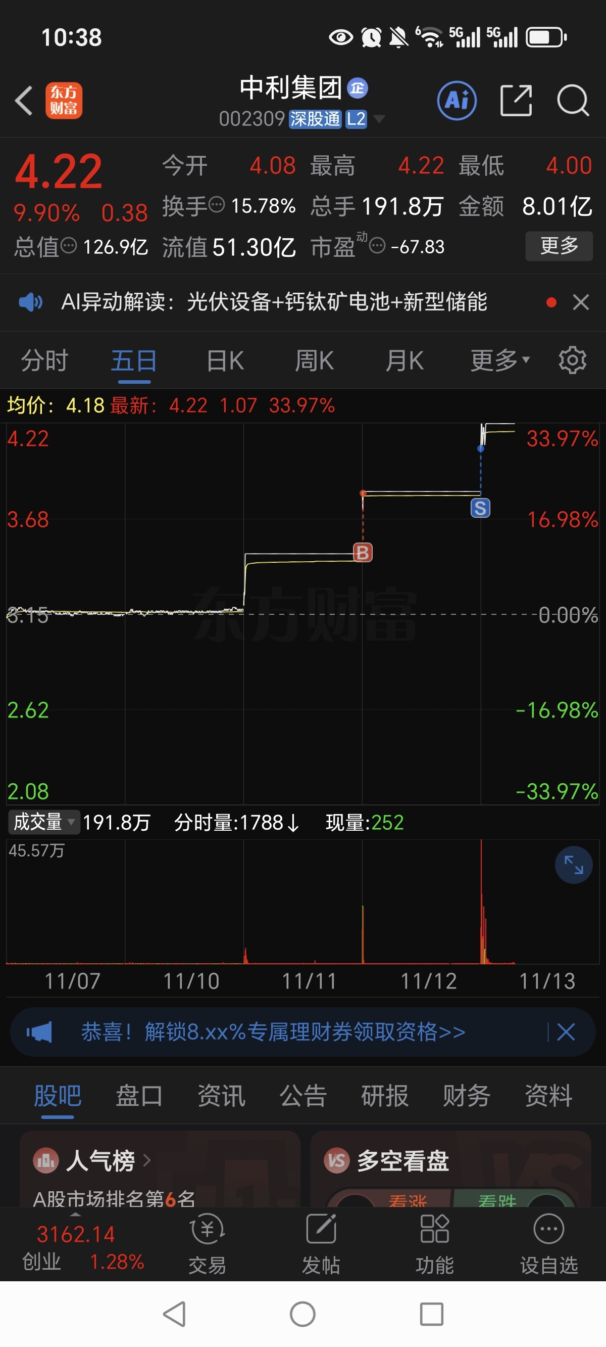 2、昨天3.82打板的中利集团,早上竞价国晟太弱,竞价4.08卖飞,隔夜落袋6个多点。