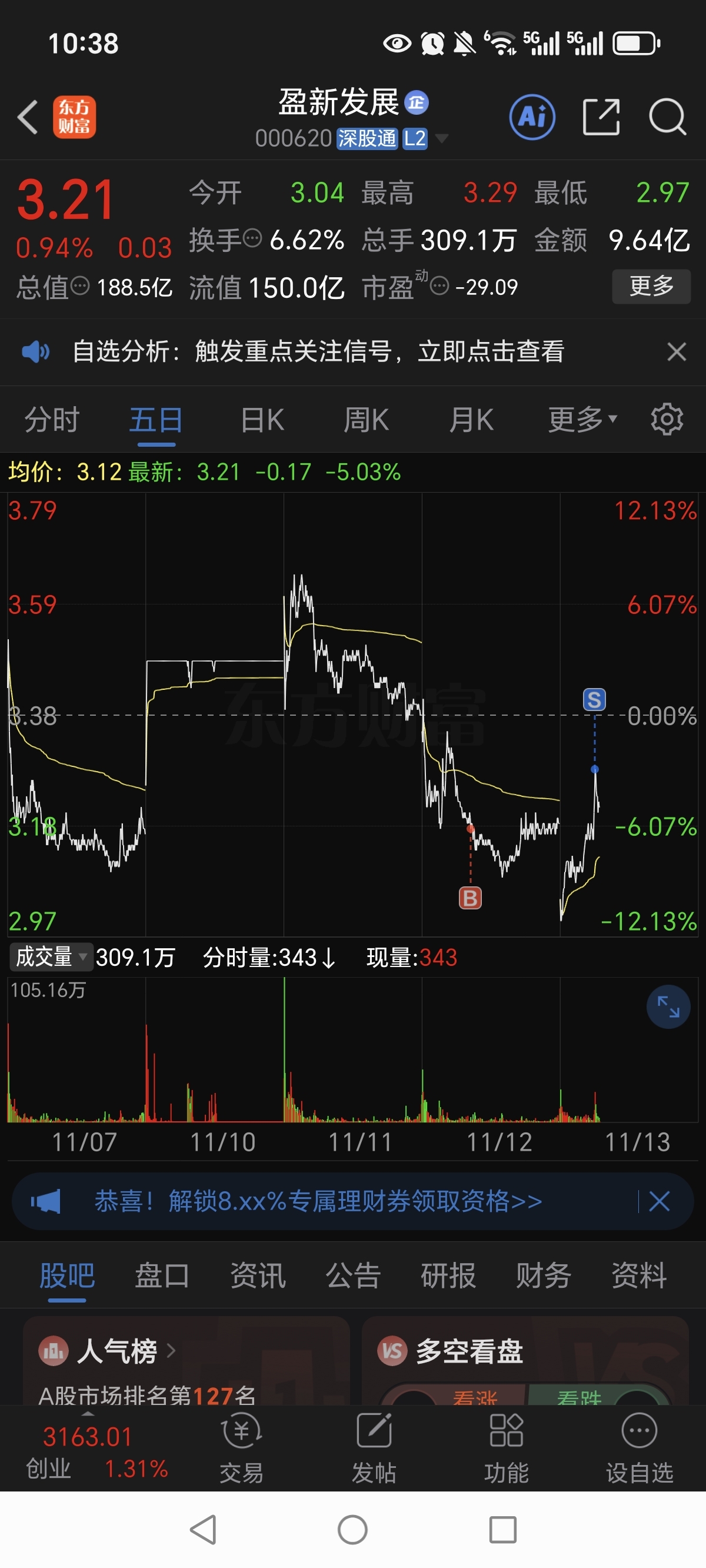 1、昨天3.17买的盈新发展,刚才3.28已卖出落袋。
