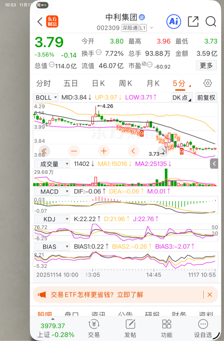 $中利集团(SZ002309)$ 从超短的5分钟线看,目前仍在下降通道里,自周五盘中反弹一下子后始终位于布林线下半区域,且贴着下轨运动。