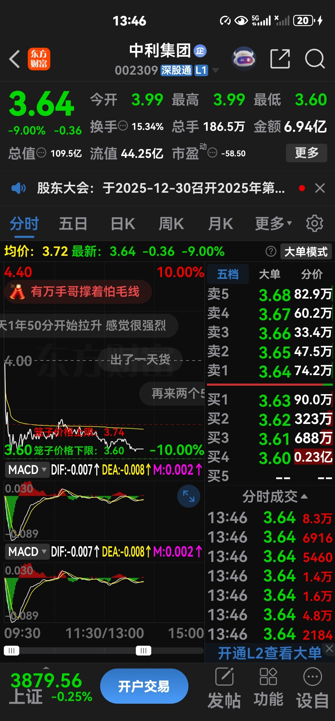 $中利集团(SZ002309)$ 一起喊跌停,明天3420买