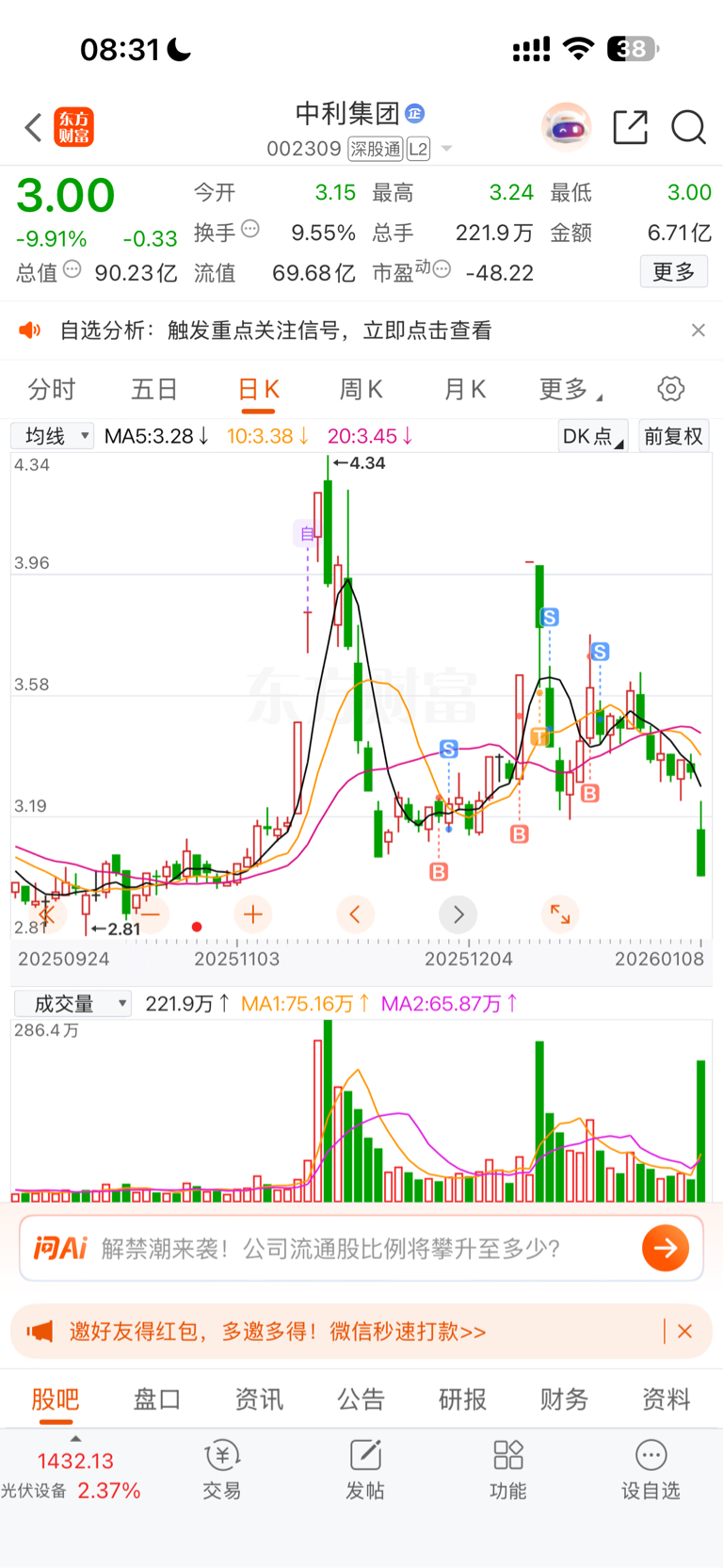 $中利集团(SZ002309)$ 吗呀 前天还好没进哦 昨天居然跌停 这个 还是远离的好