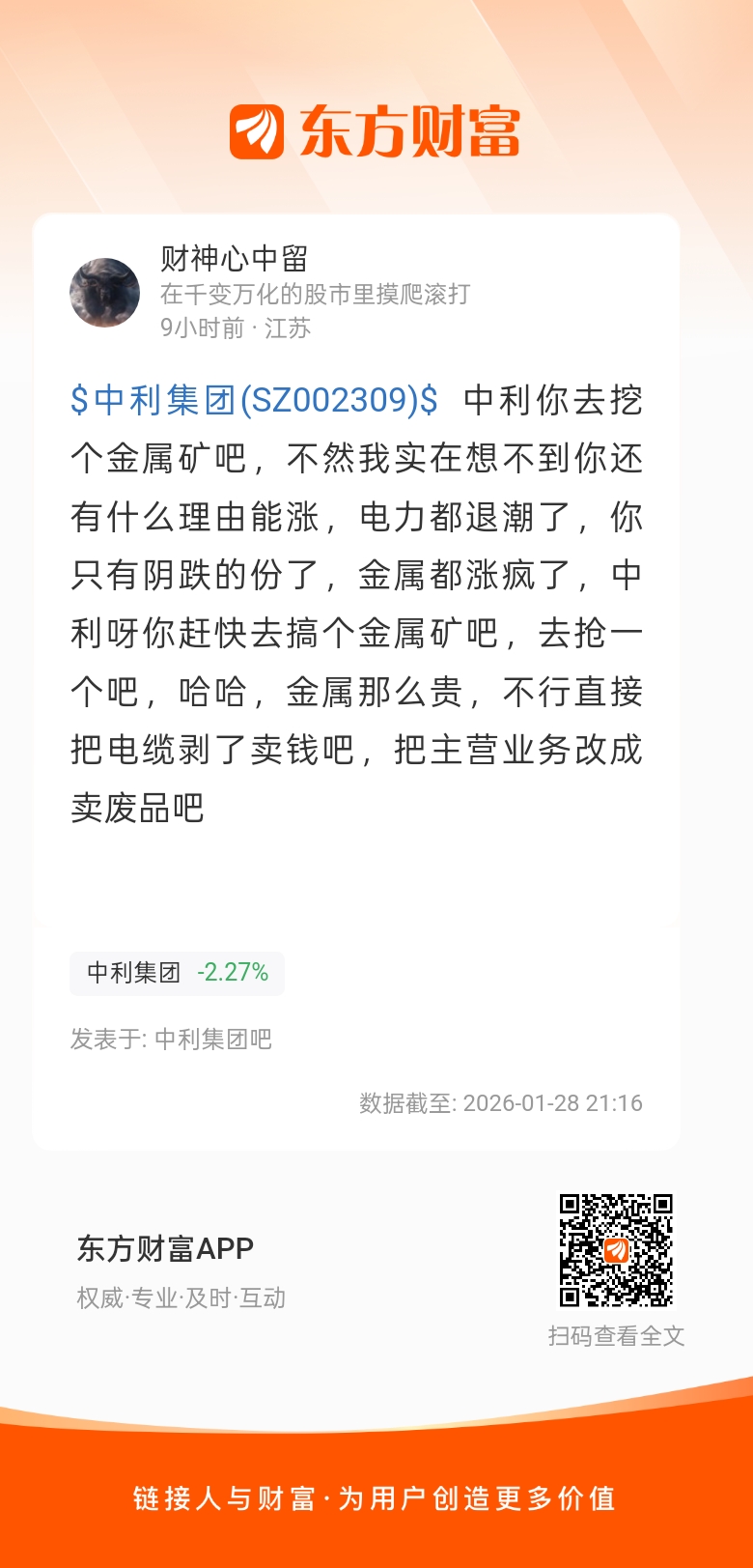 $中利集团(SZ002309)$ 中利你去挖个金属矿吧,不然我实在想不到你还有什么理由能涨,电力都退潮了,你只有阴跌的份了,金属都涨疯了,中利呀你赶快去搞个金属矿吧,去抢一个吧,哈哈,金属那么贵,不行直接把电缆剥了卖钱吧,把主营业务改成卖废品吧,不行把公司也卖了吧