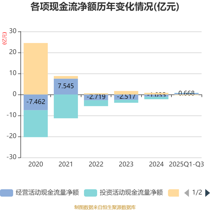 2025年前三季度,公司经营活动现金流净额为6678.69万元,同比增长170.84%;筹资活动现金流净额-3465.61万元,同比增加3390.18万元;投资活动现金流净额1148.23万元,上年同期为-1198.02万元。