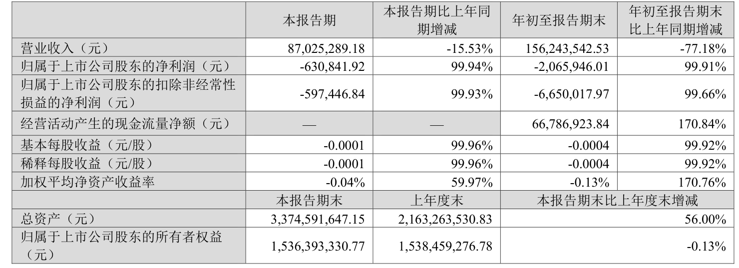 中证智能财讯东方园林(002310)10月28日披露2025年第三季度报告。前三季度公司实现营业总收入1.56亿元,同比下降77.18%;归母净利润亏损206.59万元,上年同期亏损22.8亿元;扣非净利润亏损665万元,上年同期亏损19.53亿元;经营活动产生的现金流量净额为6678.69万元,同比增长170.84%;报告期内,东方园林基本每股收益为-0.0004元,加权平均净资产收益率为-0.13%。