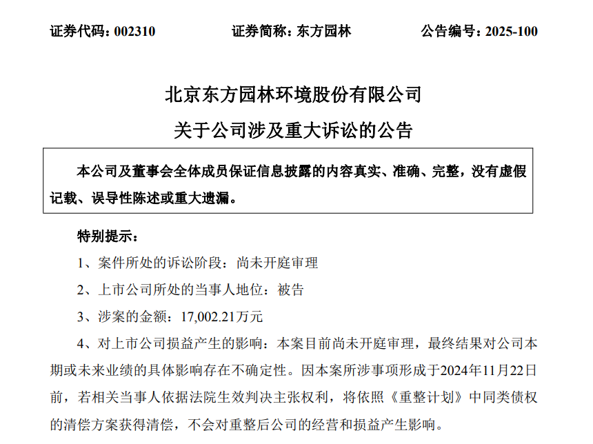 东方园林称,相关债务事实发生在2024年11月22日之前的诉讼案件,债权人可根据法律规定及相关法院的生效判决,依照《重整计划》中同类债权的清偿方案获得清偿,不会对重整后公司的经营和损益产生影响。