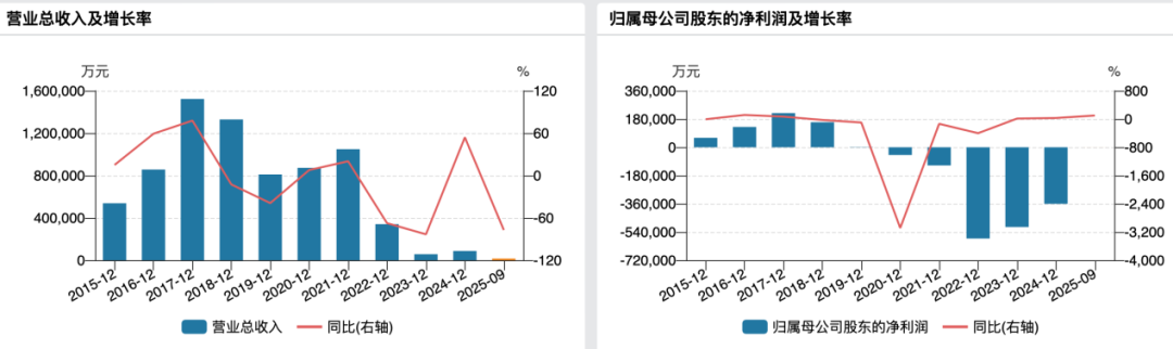 业绩方面,东方园林自2020年开始深陷亏损泥潭,至今尚未实现扭亏为盈。财报显示,2025年前三季度公司实现营业总收入1.56亿元,同比下降77.18%;归母净利润亏损206.59万元,上年同期亏损22.8亿元。