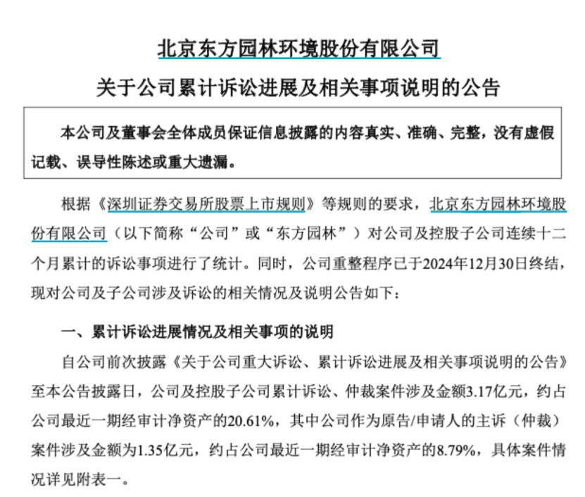 而后11月6日,东方园林再次发布涉及重大诉讼公告,披露公司近日收到北京金融法院《应诉通知书》,投资者赵某宏以证券虚假陈述责任纠纷为由起诉公司,涉案金额达1.7亿元。