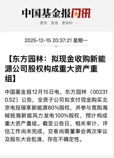 12月15日,东方园林公告称,公司全资子公司东方新能拟以现金支付方式购买海城锐海100%股权和电投瑞享80%股权。本次交易构成重大资产重组,不构成关联交易,也不构成重组上市。
