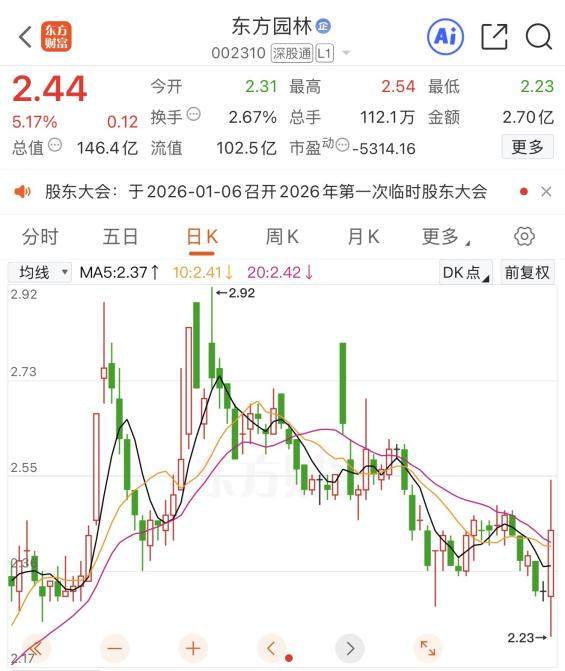截至12月15日收盘,东方园林股价收涨5.17%,收于2.44元/股,总市值为146.4亿元。