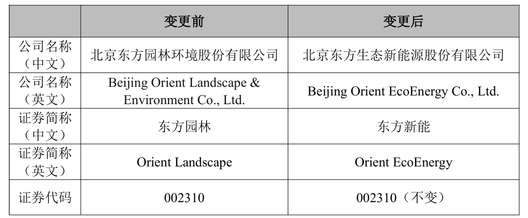 宣布收购上述两家公司的同时,东方园林同时发布公告称,拟将公司名称变更为“北京东方生态新能源股份有限公司”,证券简称变更为“东方新能”。