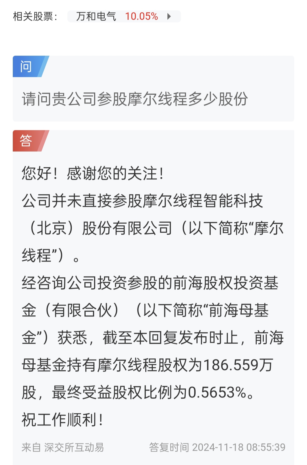 $川发龙蟒(SZ002312)$ $万和电气(SZ002543)$ 万和电气业绩稳定,年年高分红,盘子不大,间接参股摩尔,持有摩尔0.56%,值得几个涨停?