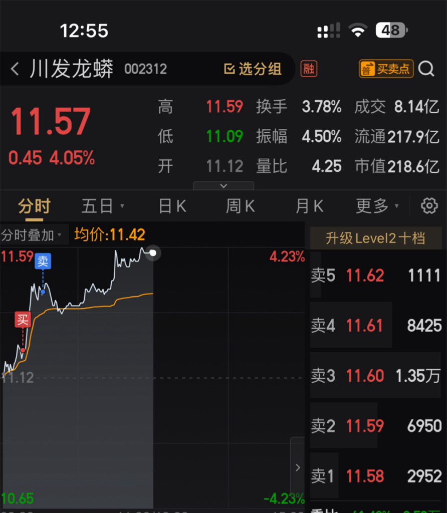 $川发龙蟒(SZ002312)$ 底舱没动,周二11.02补的,昨天11.09卖的,今天11.22接回,11.44出了。没想到今天这么猛。